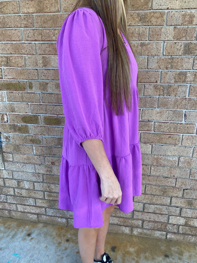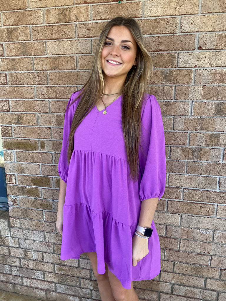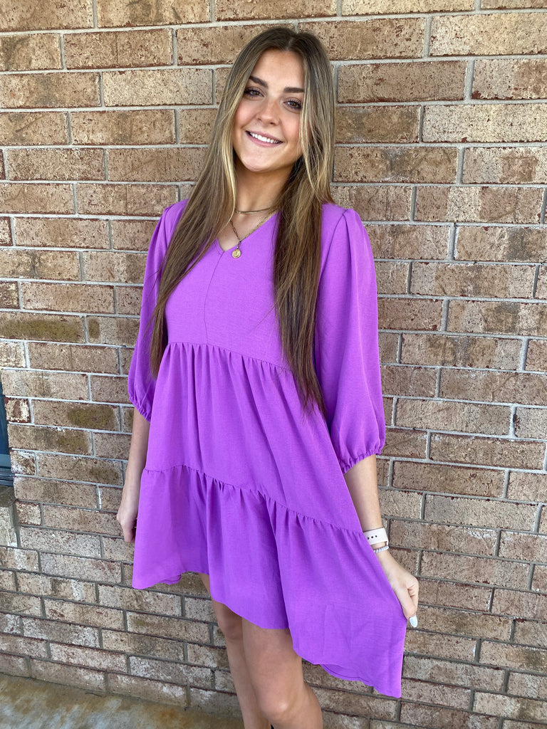 Orchid in color, this fun v neck, 3/4 sleeved dress is perfect for spring!