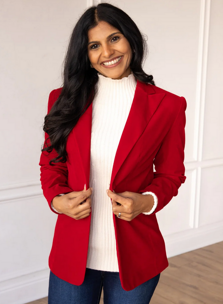 Whether you're attending a formal event, a business meeting, or a special dinner, our Red Velvet Blazer is the ideal choice. Pair it with tailored trousers or a pencil skirt for a polished and professional ensemble, or wear it with jeans for a chic and sophisticated casual look.
